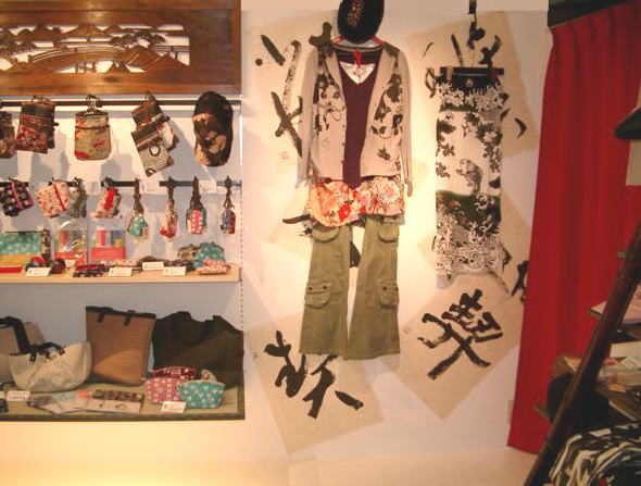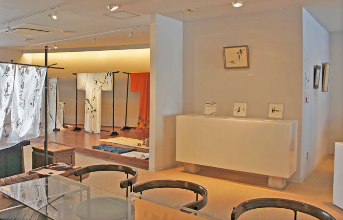 左奥に展示している、きもの、帯。
