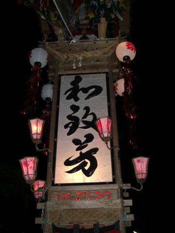 キリコは神輿の御神燈の役割で、 正面に3文字が書かれます。2005年。